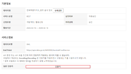 활용신청이 완료되면 아래와 같이 상세내역이 뜬다. 이 중에서 일반 인증키(제공하는데이터마다 다를 수 있음) 번호를 복사해둔다. 인증키가 있어야만 해당 데이터에 접근하는 권한을 주기 때문에 필히 따로 보관을 해야한다.