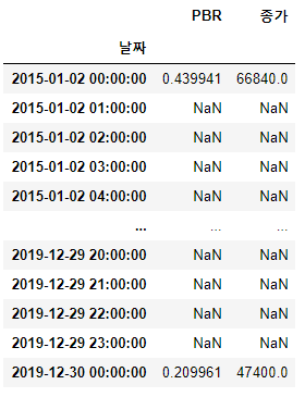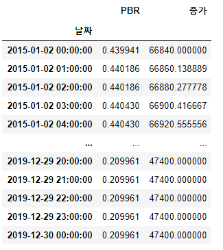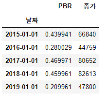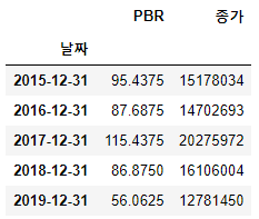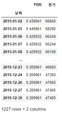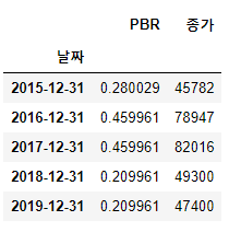 PBR과 종가 데이터를 불렀습니다. 지금 데이터는 일자별로 PBR과 종가를 표시하고 있습니다.