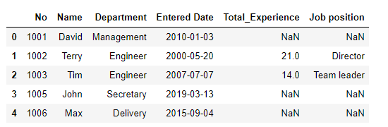 df_1 = pd.DataFrame(data1,columns=['No','Name','Department','Entered Date'])