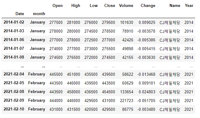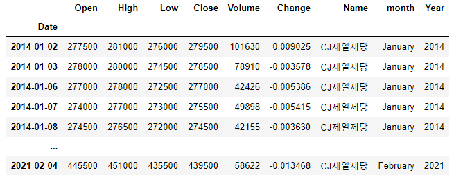 Date 를 인덱스로 설정했고 2014~2021년 1월까지의 데이터를 가져왔습니다.