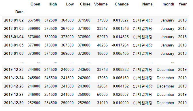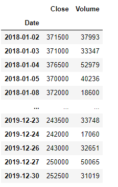 2018~2019년의 Close와 Volume만 가져오겠습니다.