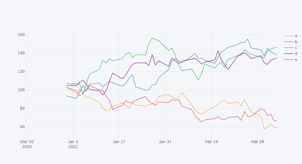 df = pd.DataFrame(100+5*data,columns=list('abcde'),index=index)